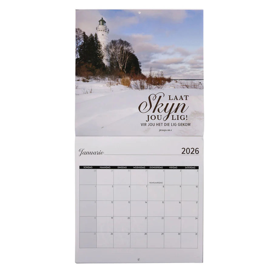 Brighten up someone's office or home and encourage their faith at the same time when you give them this 2026 Ek Is die Lig vir die Wêreld Wall Calendar as an end-of-year or New Year's gift.