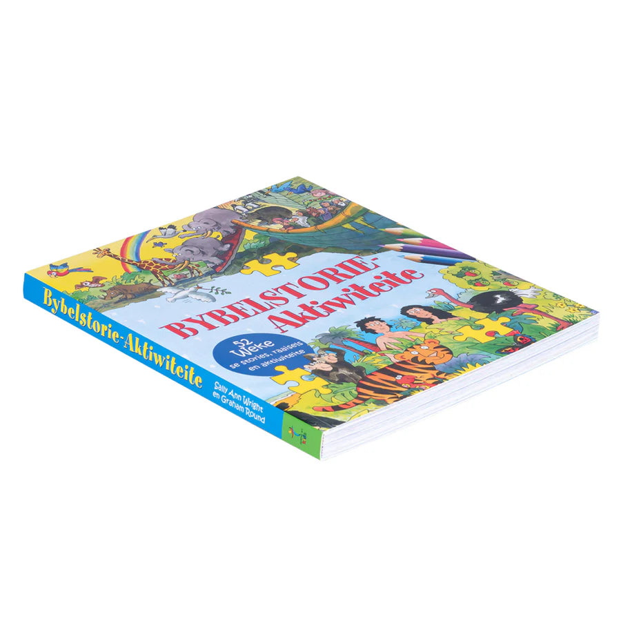 Die Bybelstorie-aktiwiteitsboek is die ideale manier om ’n liefde vir God se Woord by 5- tot 8-jariges te kweek. 52 bekende Bybelstories uit die Ou en Nuwe Testament, soos Noag se ark, Josef se spesiale kleed, Dawid en Goliat, en Jesus se geboorte, wonderwerke, dood en opstanding, word op ’n maklik verstaanbare manier oorvertel. Elke storie sluit af met twee aktiwiteite soos soek die verskille, soek die woorde, kleur in volgens nommers en voltooi die prentjie.