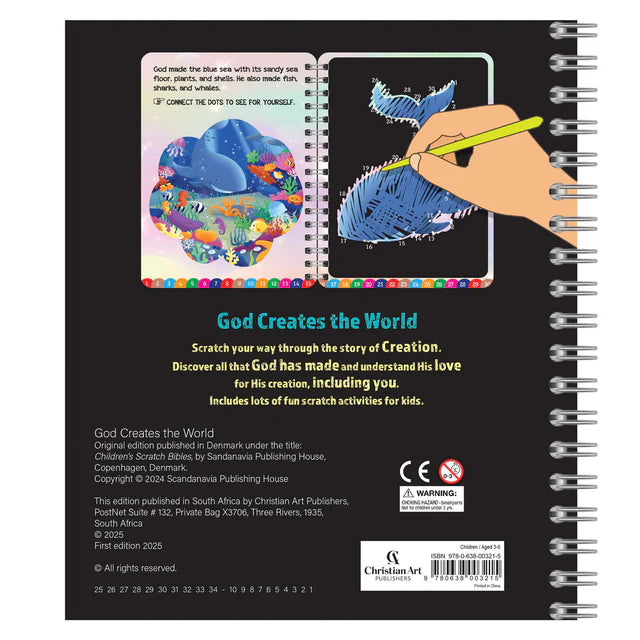 In God Creates the World Children's Scratch Bible -Scratch Your Way Through the Bible, kids aged 3-6 will discover all that God has made and understand His love for His creation—including His children—with 11 exciting scratch activities to complete along the way! Little ones will have hours of fun scratching off the top layer to reveal the colorful illustrations underneath and uncover new surprises about God’s creation!