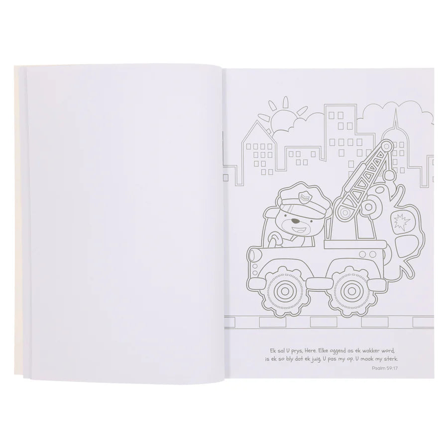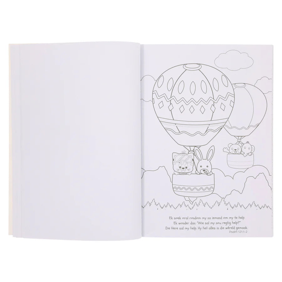 Is jy op soek na ’n inkleurboek met ’n positiewe boodskap? God is by my waar ek ook al gaan: ‘n inkleur avontuur vir kinders is ideaal! Elkeen van die 40 inkleurbladsye bevat illustrasies van oulike diertjies wat oor die wêreld reis, asook Bybelse waarhede wat jong kinders sal herinner aan God se sorg en liefde. Terwyl hulle inkleur, sal kinders al hoe meer bewus word dat God by hulle is, of dit nou in die ruimte of diep onder in die oseaan is. Daar is ook 10 bladsy met prentjies wat hulle kan inkleur en uitknip.