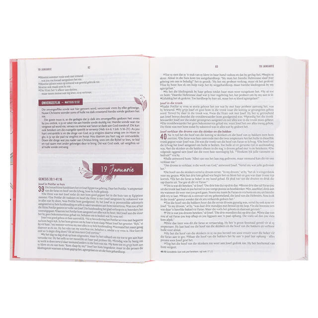 Die daaglikse indelings van die Ou en Nuwe Testament, saam met gedeeltes uit Psalms en Spreuke, nooi vroue om die hele Bybel in ’n jaar deur te lees. Die oordenkings vir elke oggend en aand sal hulle bemoedig om hierdie Bybel jaar na jaar te lees terwyl hulle die Skrifwaarhede oor verhoudings, werk, familie, geloof, gebed en persoonlike groei in hulle lewens toepas.