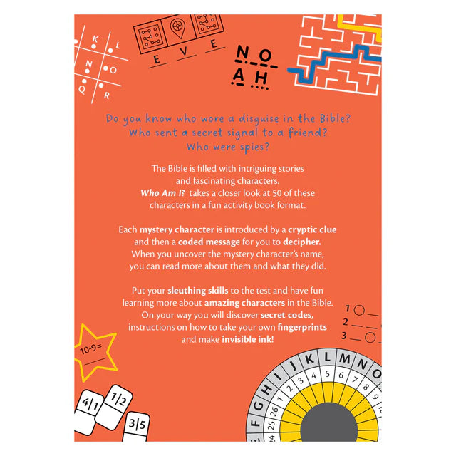Who Am I? contains 50 mystery Bible characters whose names are hidden in code. A cryptic clue is given for each character and then a coded message that contains their name. Once the code is cracked kids can read up on the character and learn more about them.